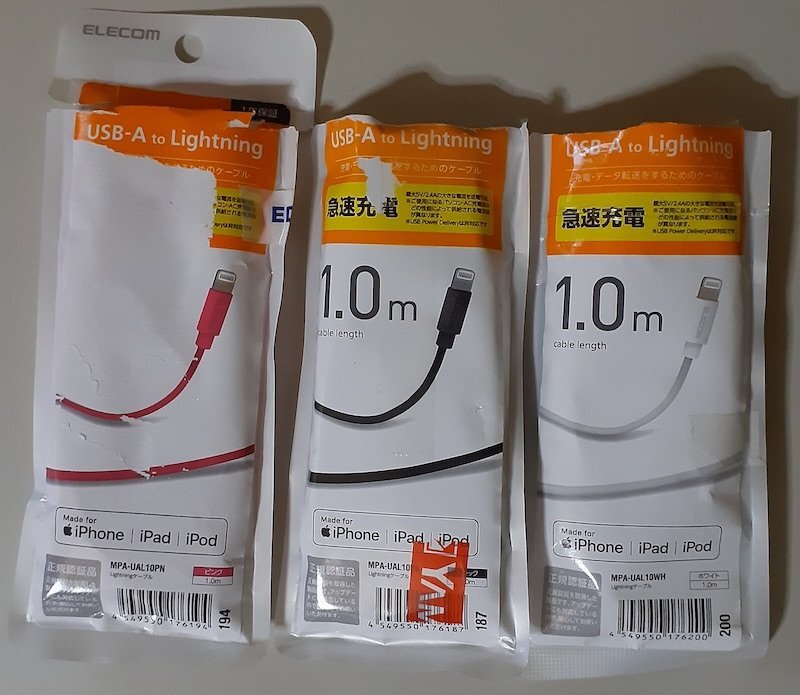 - 6762 Lightningケーブル 1.0m 3色まとめて ELECOM USB-A - Lightning MPA-UAL10PN ピンク / MPA-UAL10BK 黒 / MPA-UAL10WH 白