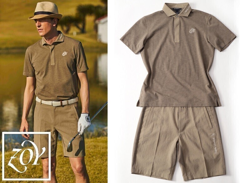 > ★正規★ZOY ゾーイ★DOT MESH COOLワイドスプレッドカラー半袖ポロシャツ&Thick&Thin Stretchショートパンツ 上下セット★サンドベージュ