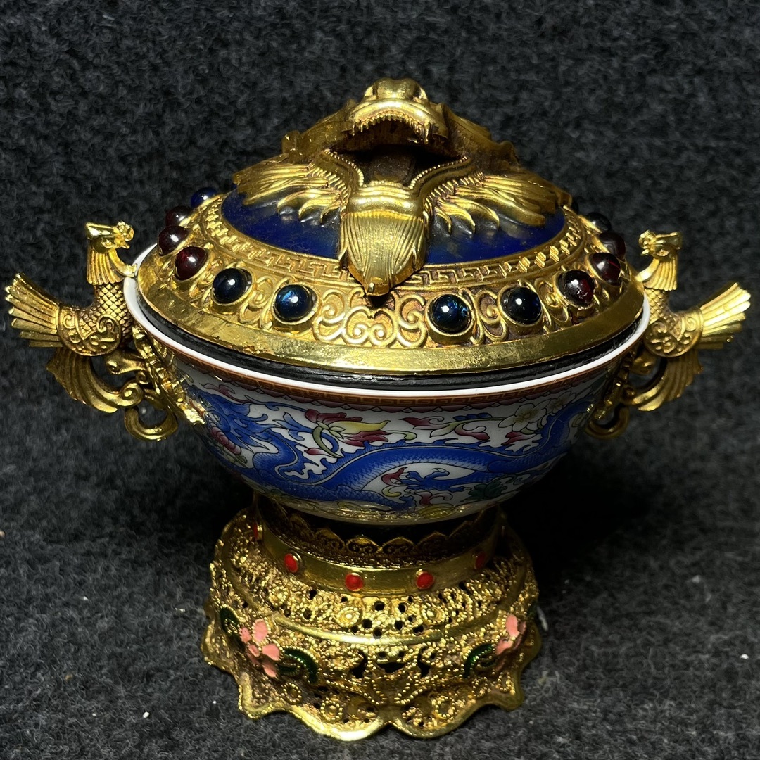 - 【超珍館蔵】陶瓷器 銅嵌 塗金 寶石嵌 龍鳳紋 蓋碗 供碗 陶瓷 古賞物 古董品 古美術品 時代物 旧家蔵出 稀少珍蔵品