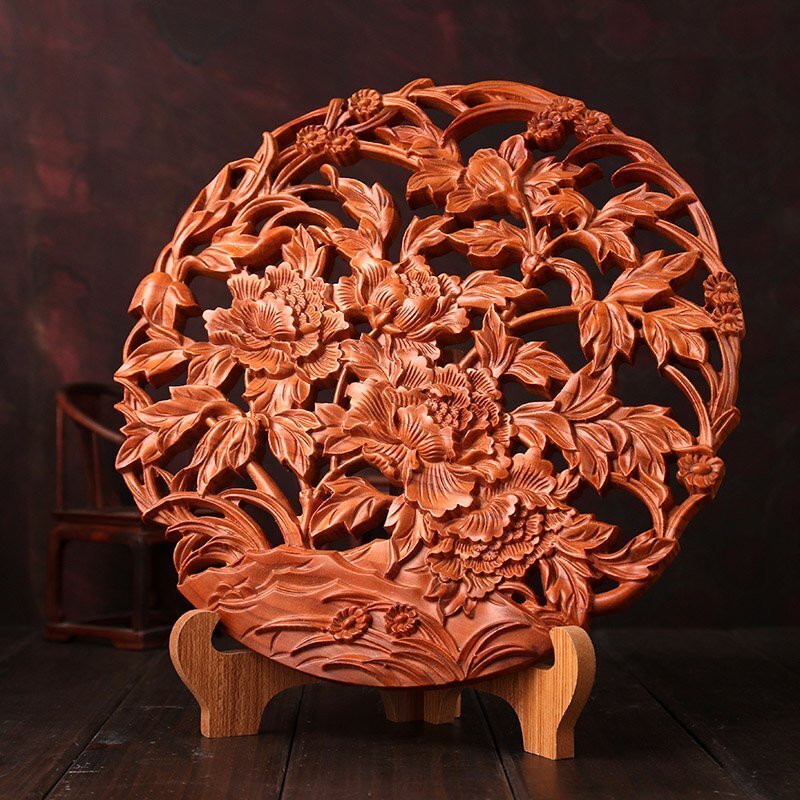 - 店長勧め 極美品 ! 中国工芸品 置物 花開富貴 彫刻 桃ノ木 桃木 スタンド付き 風水 鑑賞 装飾 zh732