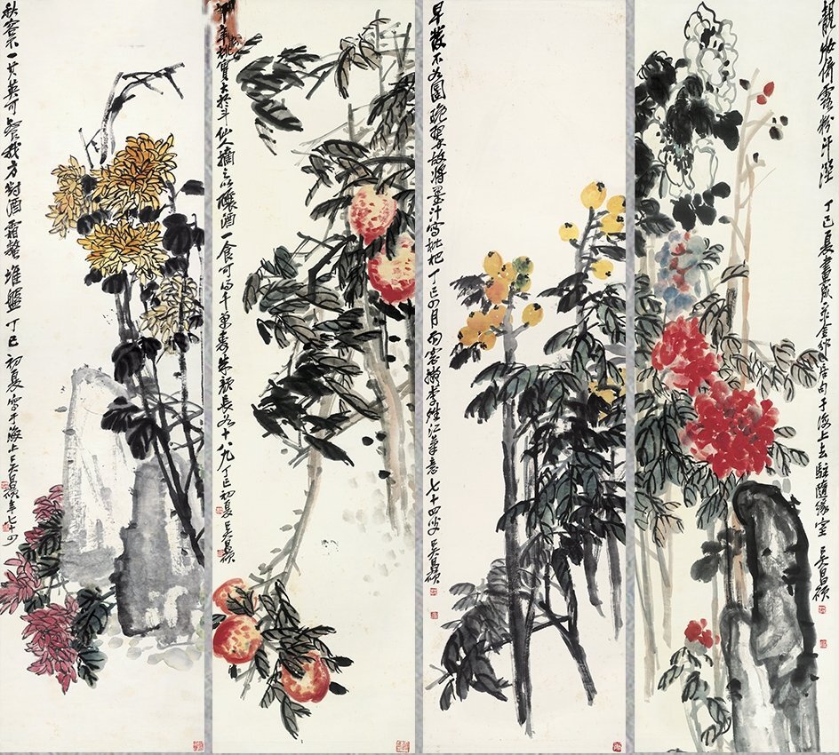 - 店長勧め 極美品 ! 中国美術 呉昌碩 4枚セット 表装なし 画仙紙 画芯 静物画 花絵柄 鑑賞 装飾 印刷 zh726