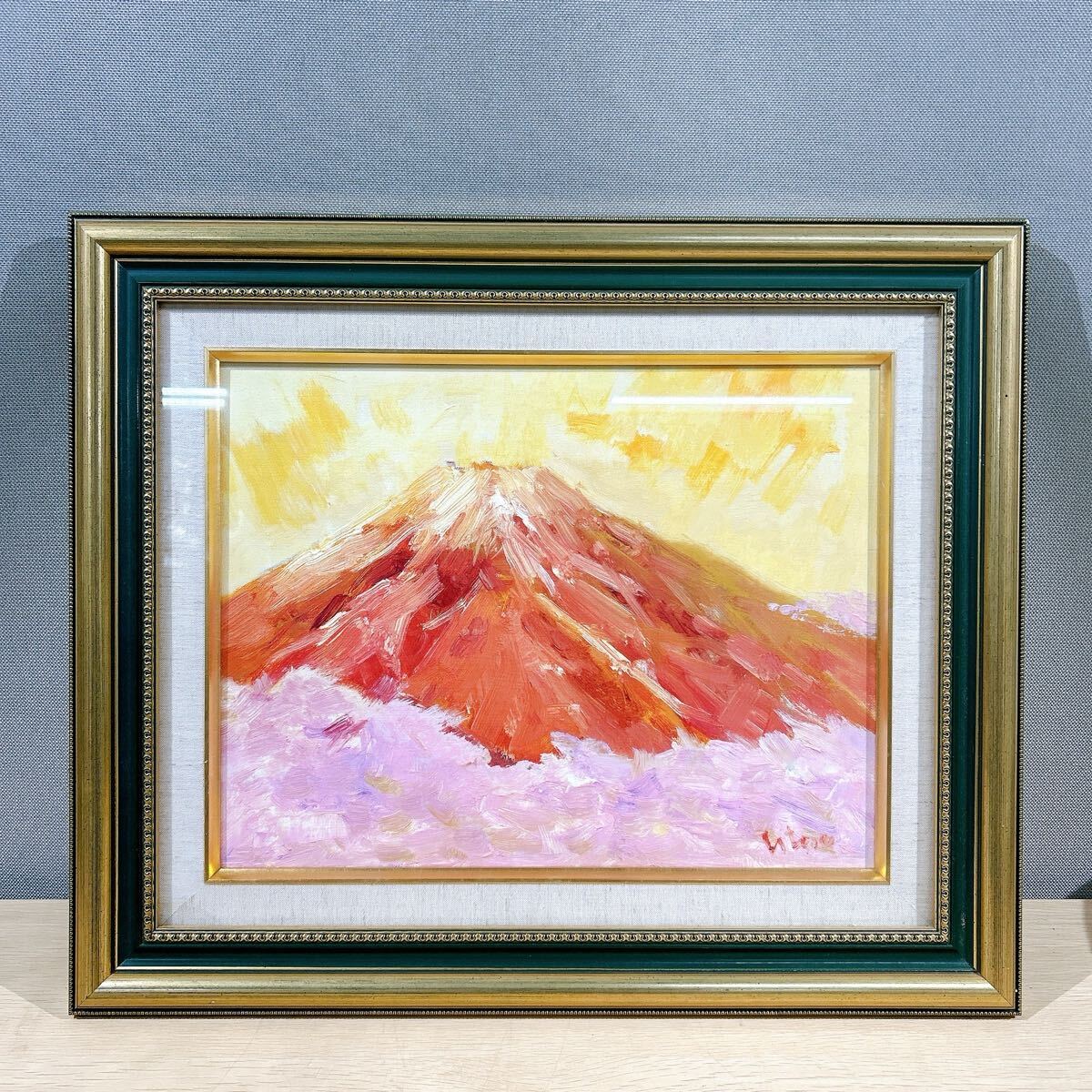 - ★赤富士 額装 縁起物 油彩画 サインあり 幅56cm 縦46.5cm