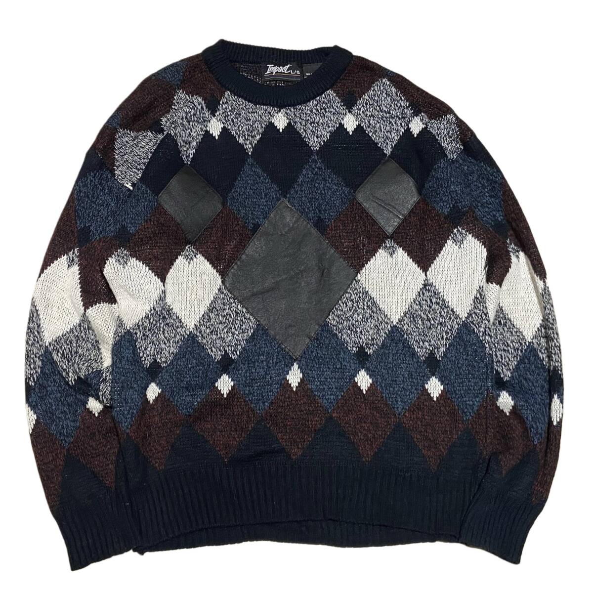 - 希少 レザーパッチ【90s ビンテージ Impact レザーパッチ アーガイルニット L 】アメリカ USA デザイナーズ