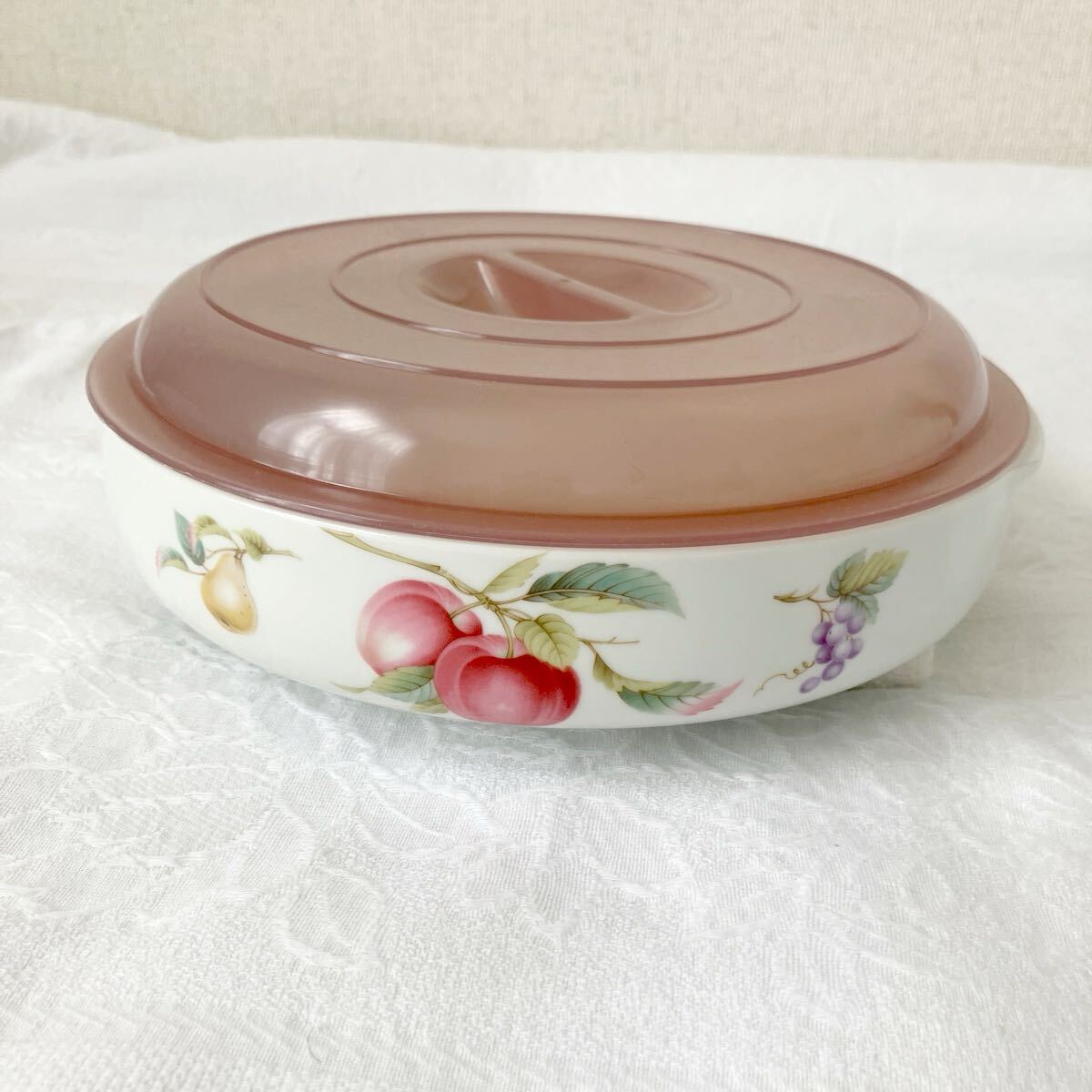 - m43)電子レンジ 蓋付 深皿 フルーツ柄 20.5cm 蒸料理 保存容器 作り置き 昭和 レトロ ビンテージ 食器 ヴィンテージ 皿