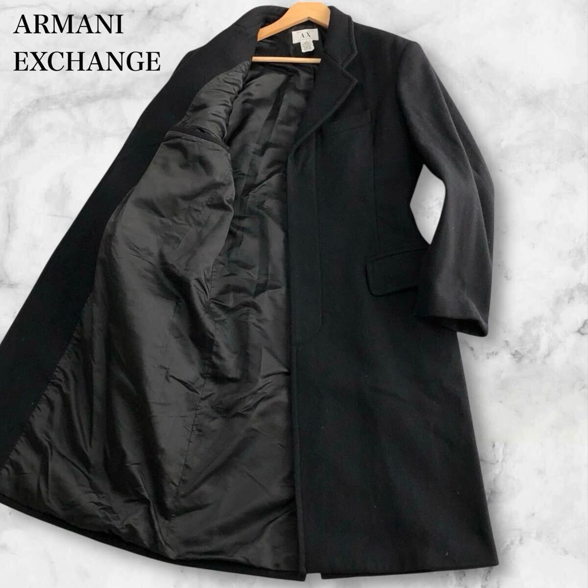 > 美品/L相当●ARMANI EXCHANGE アルマーニ エクスチェンジ チェスターコート ロング アウター ウール 美シルエット◎ ブラック 黒 メンズ