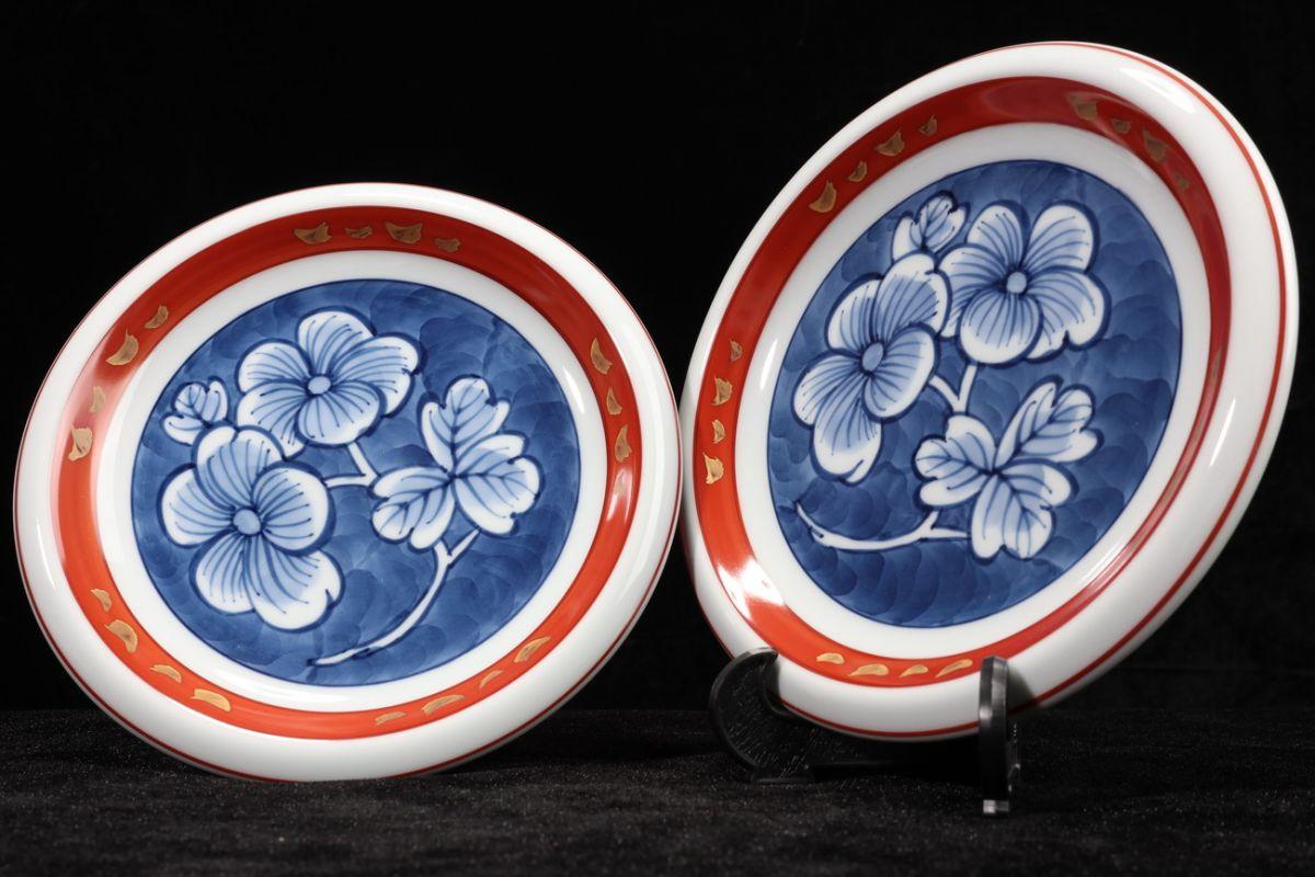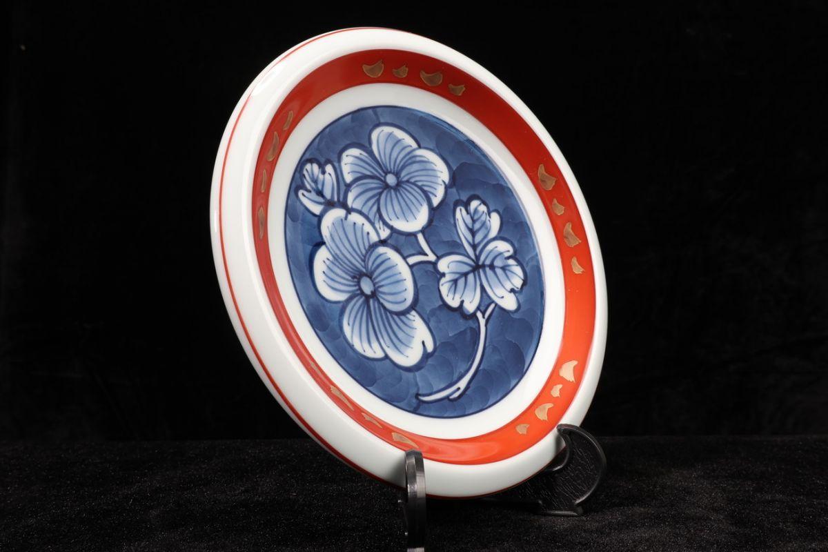 - 【珍品堂】1円から Y72-V03 有田焼 館林源右衛門窯 染錦 牡丹見込 皿 5客 径17cm 名窯 共箱 木箱 置台 骨董品 古美術 時代物