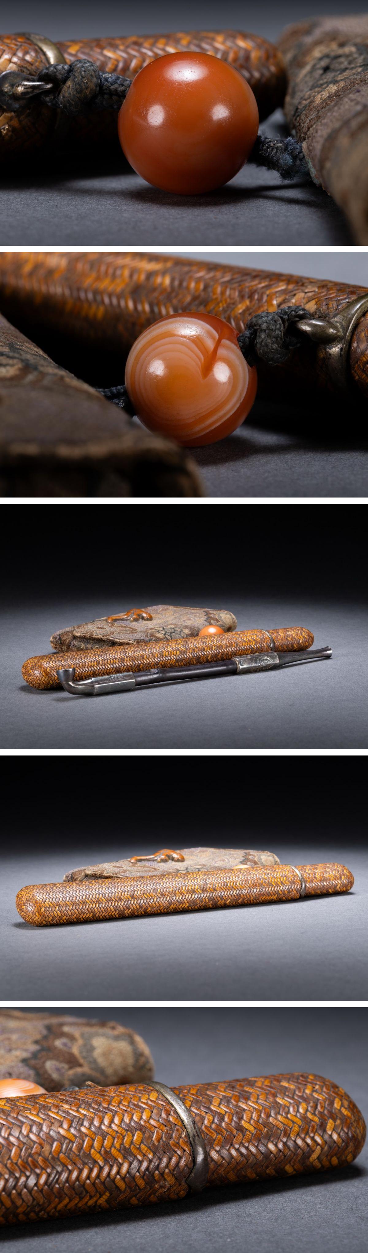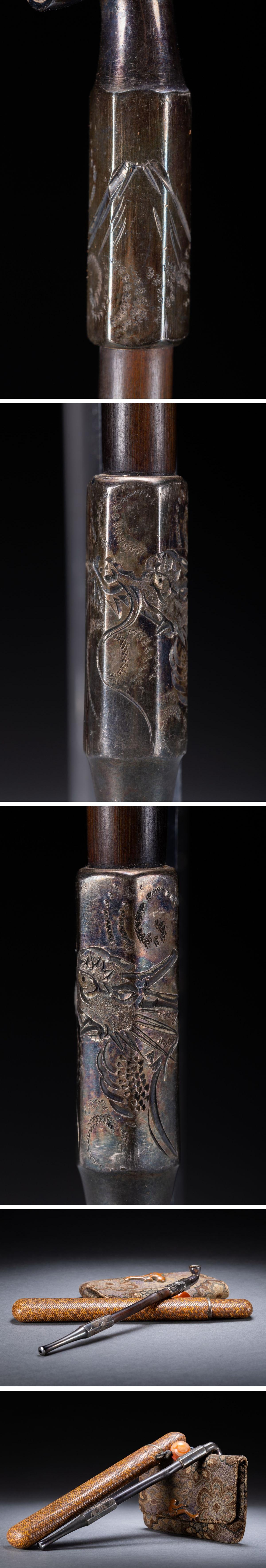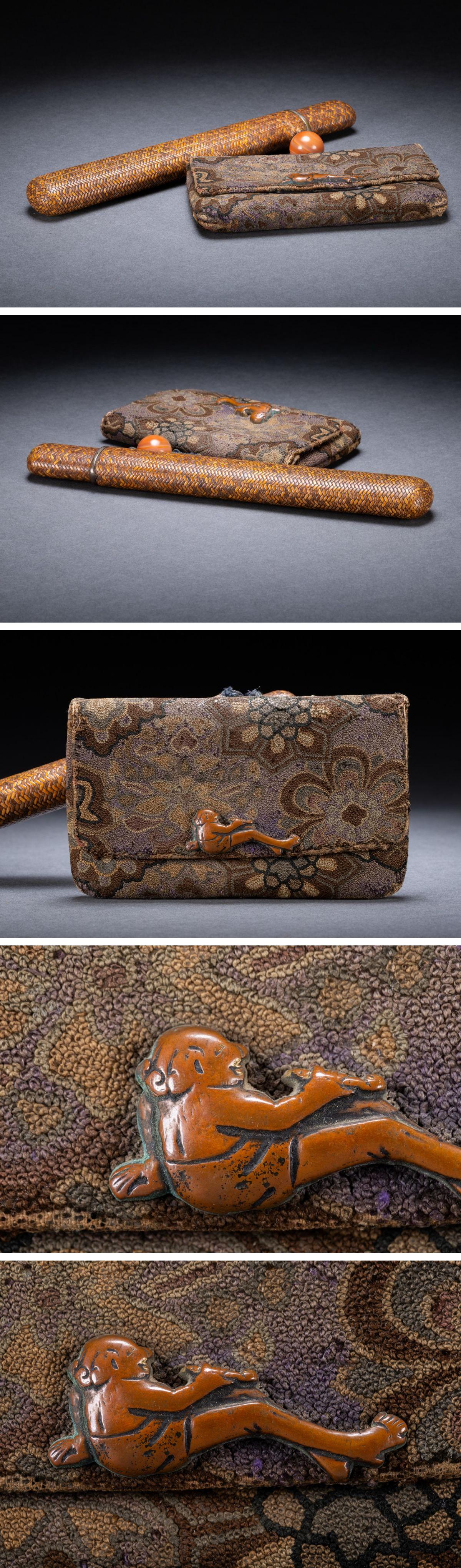 - 【雲錦】某有名オークション購入 江戸時代 竹編煙管筒・純銀富士文煙管・金唐革煙草入 古置物 古擺件 古美術 時代コレクションWK9-179L34