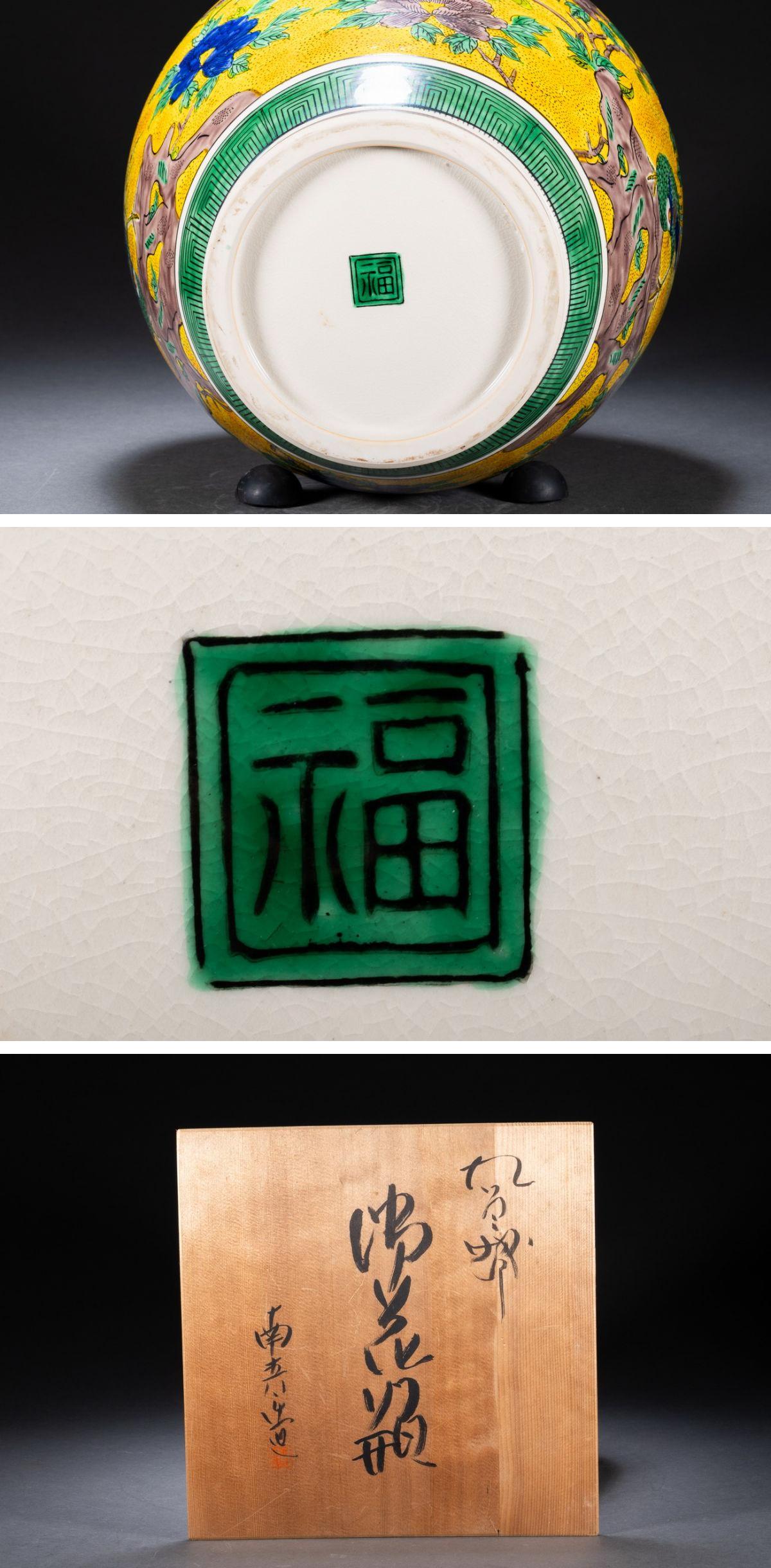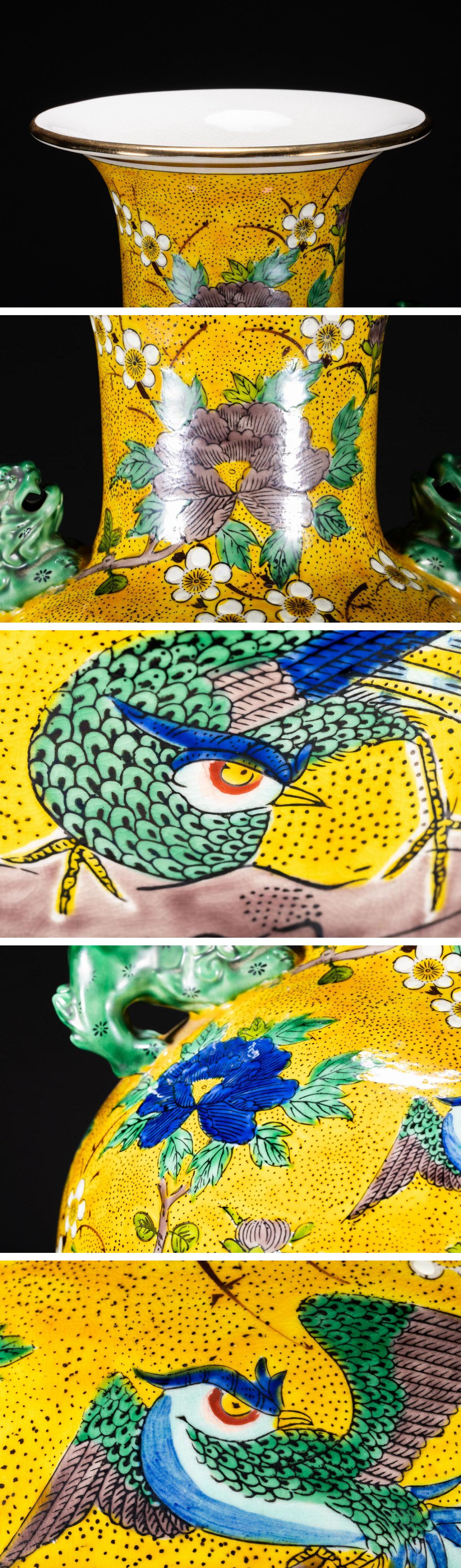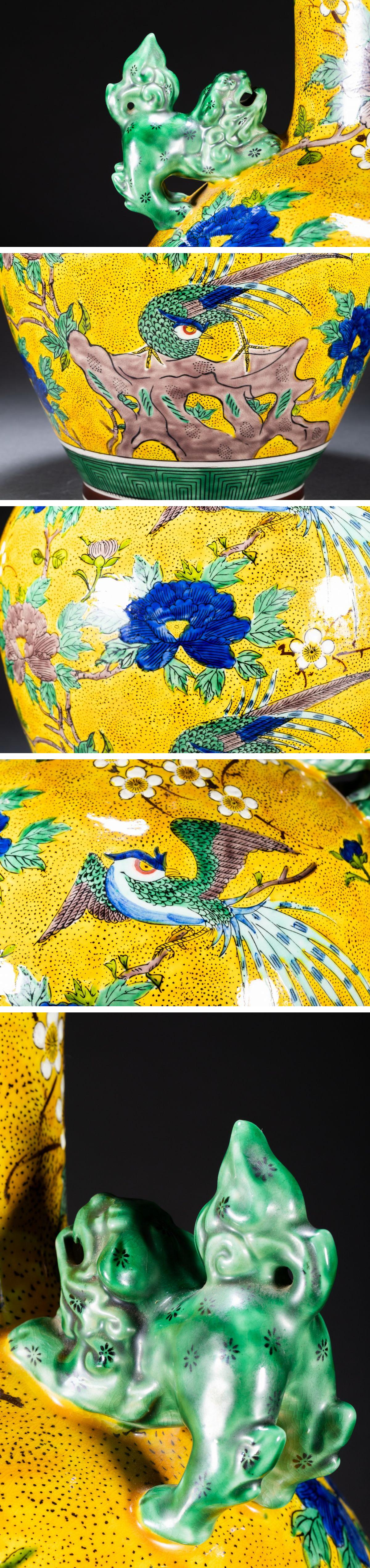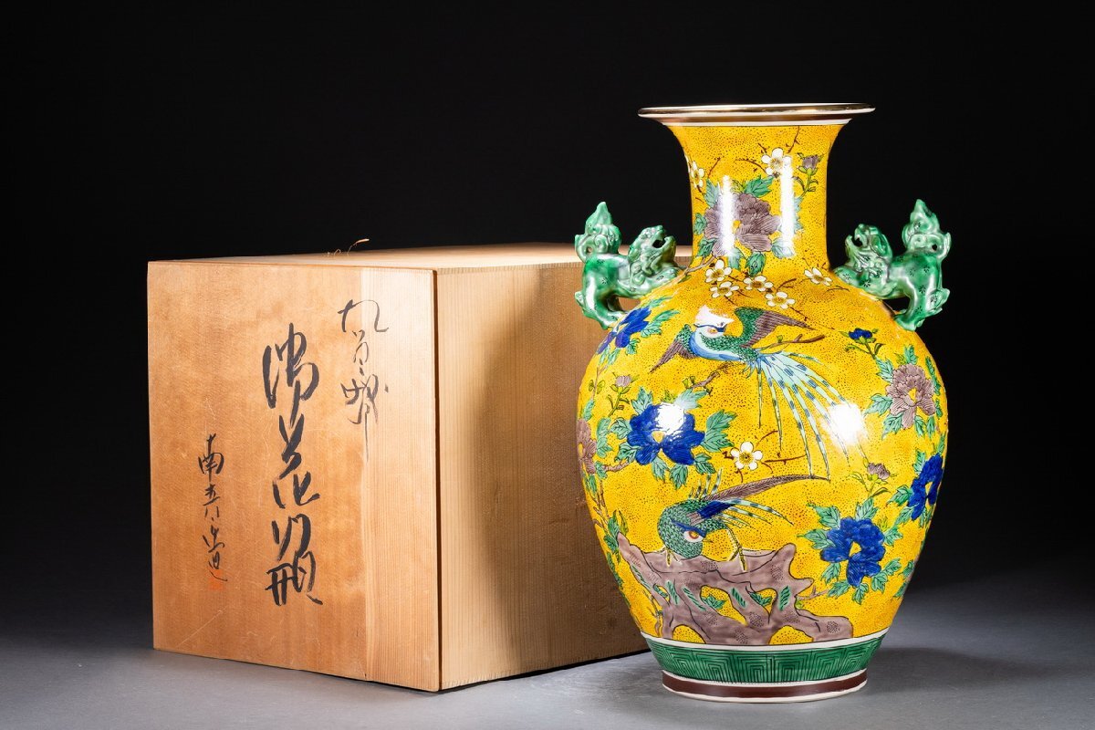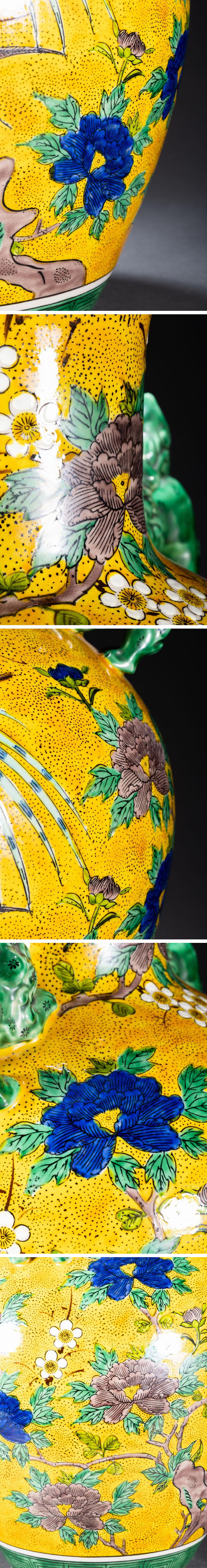 - 【雲錦】九谷焼 南春造 青手 巨大花鳥図双唐獅子耳花瓶 55CM希少 真作保証 美術品WK9-141L