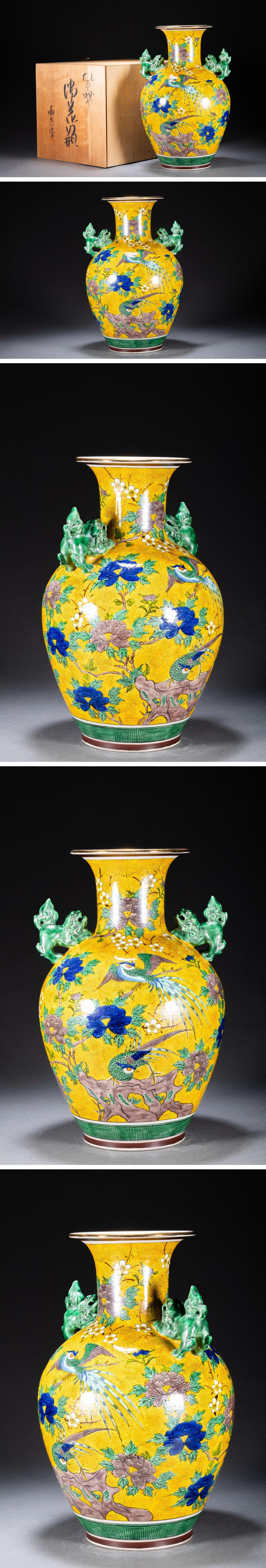 > 【雲錦】九谷焼 南春造 青手 巨大花鳥図双唐獅子耳花瓶 55CM希少 真作保証 美術品WK9-141L