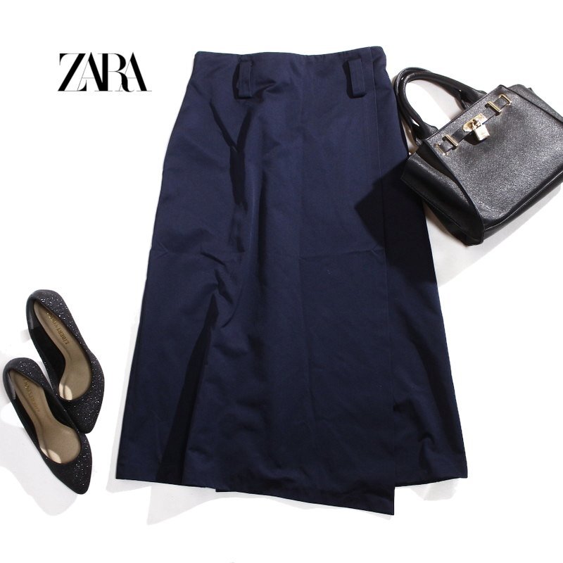 > 美品 ZARA BASIC ザラ ベーシック 合物 通年 ハリ 艶 ミディ ミモレ丈 シンプル Aライン ラップ風 スカート L ネイビー 紺 ポリエステル