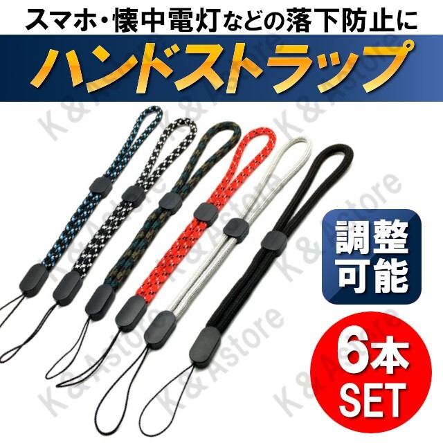 > リストストラップ ハンドストラップ 調整式 アジャスター付き スマホ 携帯 懐中電灯 キーホルダー カメラ 赤 黒白 灰色 青 緑 黒 6本