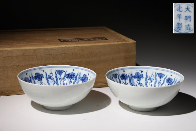 > ☆寒椿☆大明成化年製 白磁染付碗 二客 鳳凰紋 (検)青華 茶碗 鉢 唐物 中国美術 古玩