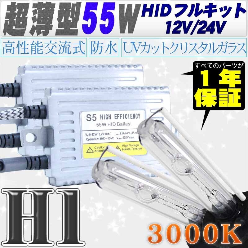- 高性能 薄型HIDキット 55W H1 3000K 12V/24V 【交流式バラスト&クリスタルガラスバーナー】