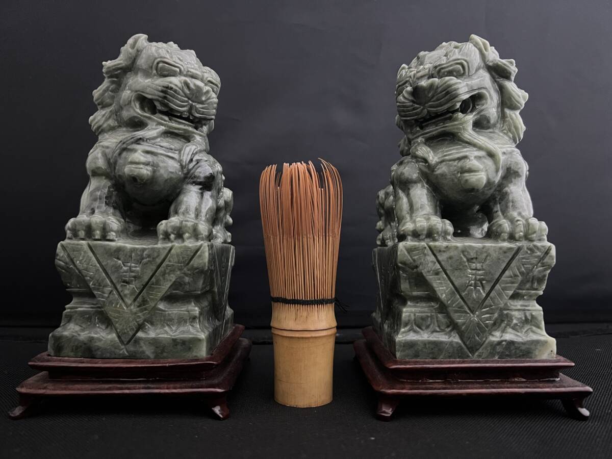 - 玉彫 獅子 ペア 彫刻 置物 金運 開運 風水 魔除 パワーストーン 骨董 美術 インテリア アンティーク