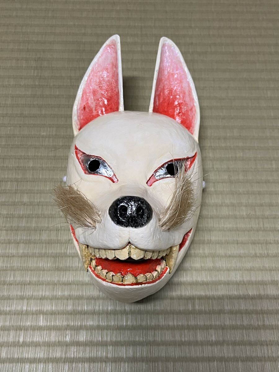 - 備中神楽 面 白狐 狐 キツネ 神楽面 創作木彫 能面 狂言面 伝統工芸 魔除け