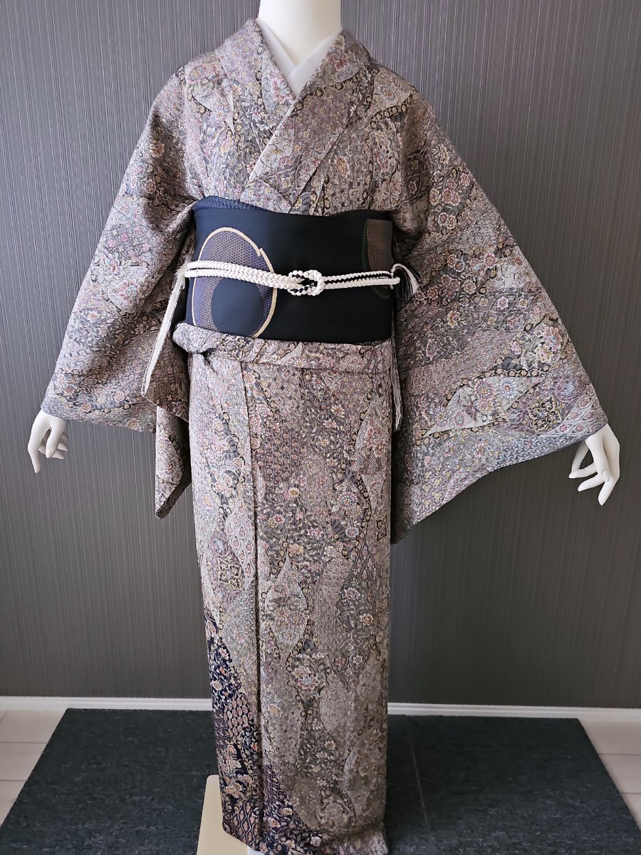 > すずや■506【袷】正絹【江戸更紗更甚】小紋 裄丈69cm 着丈167cm 茶鼠系