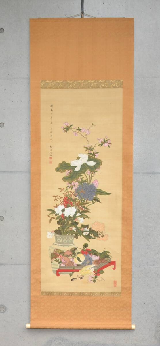 - 【模写】 12◆初荷です ◆掛軸 中国 霞渓紀知 鮮やかな生花果実図 絹本 ◆保存箱