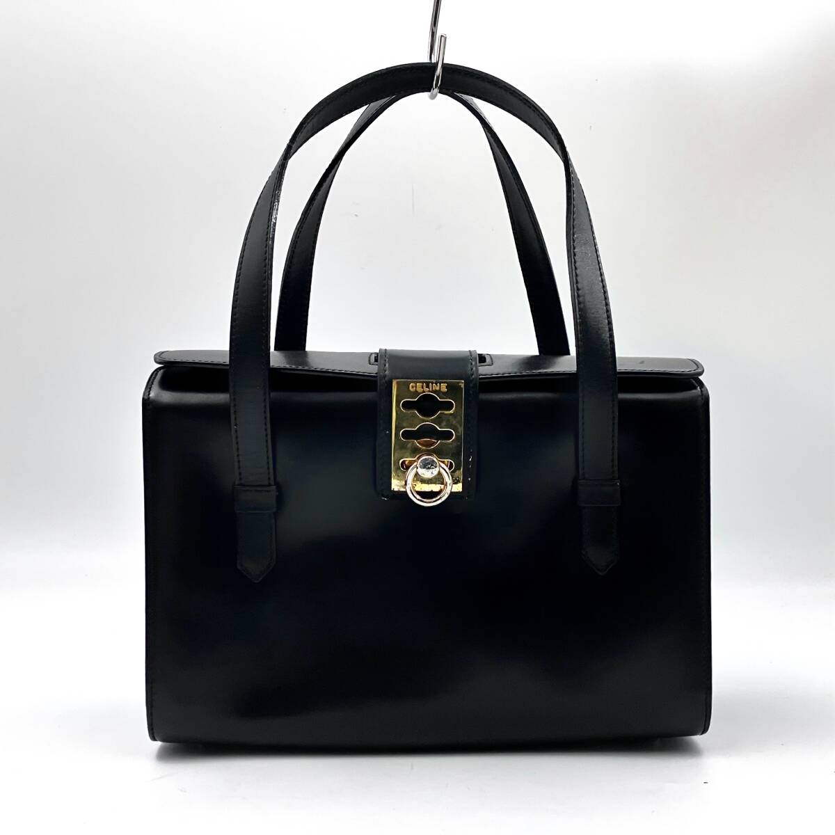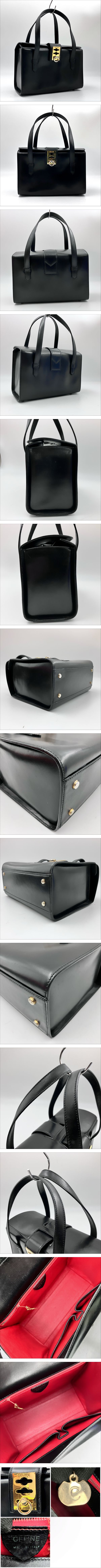 > 1円~ 三連金具● セリーヌ 2927 CELINE ハンドバッグ 黒 ブラック レザー ガンチーニ ゴールド金具 チェーン スクエア型