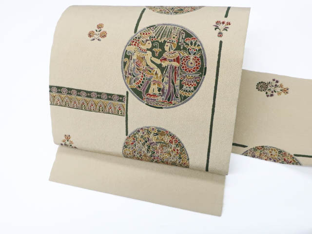 - 《古美術京松》リサイクル着物 九寸名古屋帯 全通柄 ちりめん 正絹 kyo7b09-221