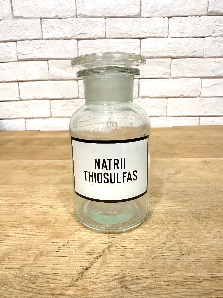 クリアガラスに、ブラックカラーでNATRII THIOSULFASの文字がデザインされた商品です。