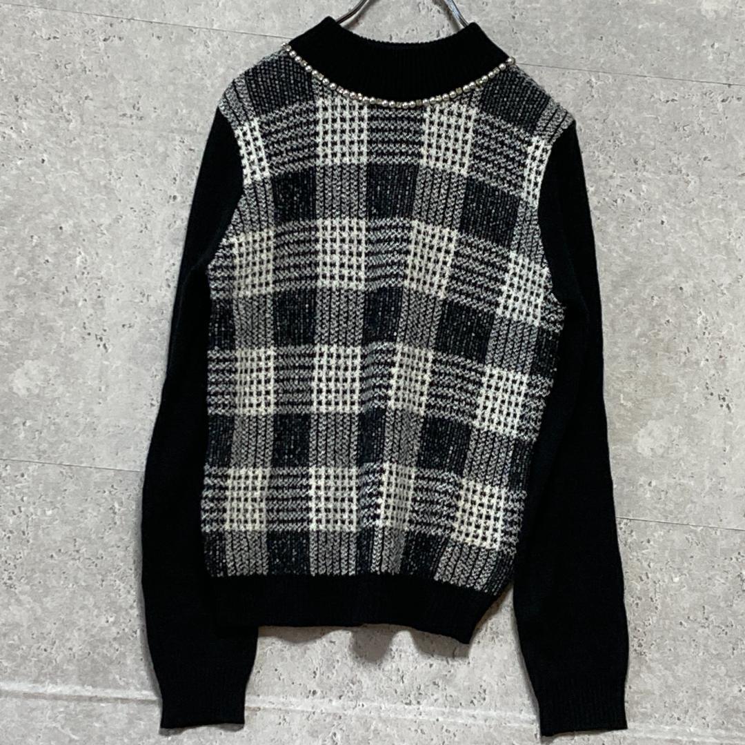 - アンバスケット(L)チェック柄ニットセーター*長袖*パール*伸縮性*ブラック