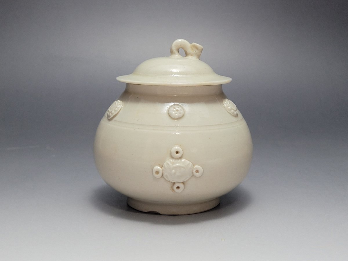 > 純白磁 陽刻 神獣面 花文 装飾 蓋壺 時代唐物 高さ約8.7cm / 宋元時代 花瓶 飾瓶 花插 花器 唐物 人間国宝 李朝 高麗 古玩 古董