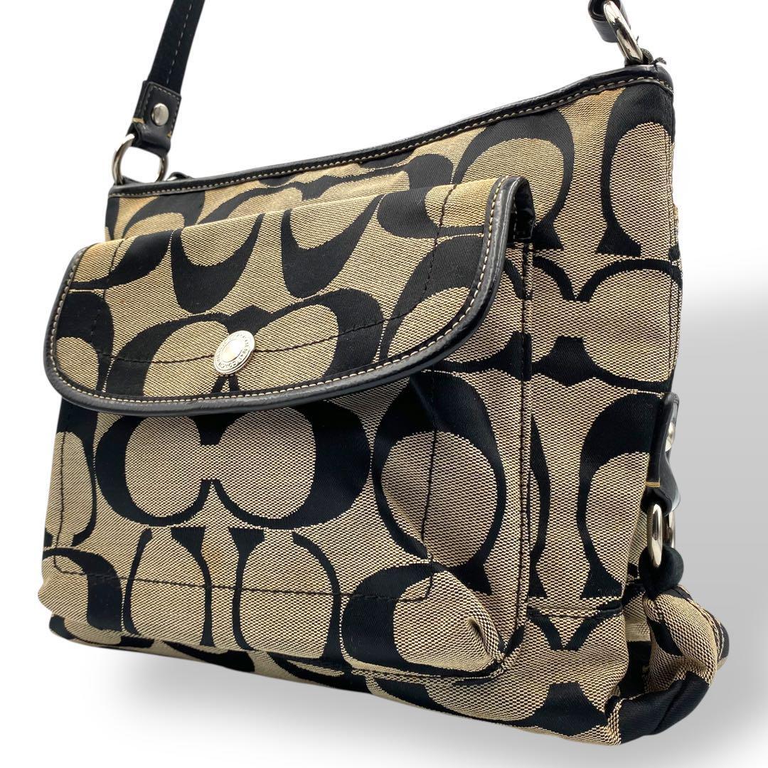 - 美品 COACH コーチ ショルダーバッグ シグネチャー キャンバス レザー 黒