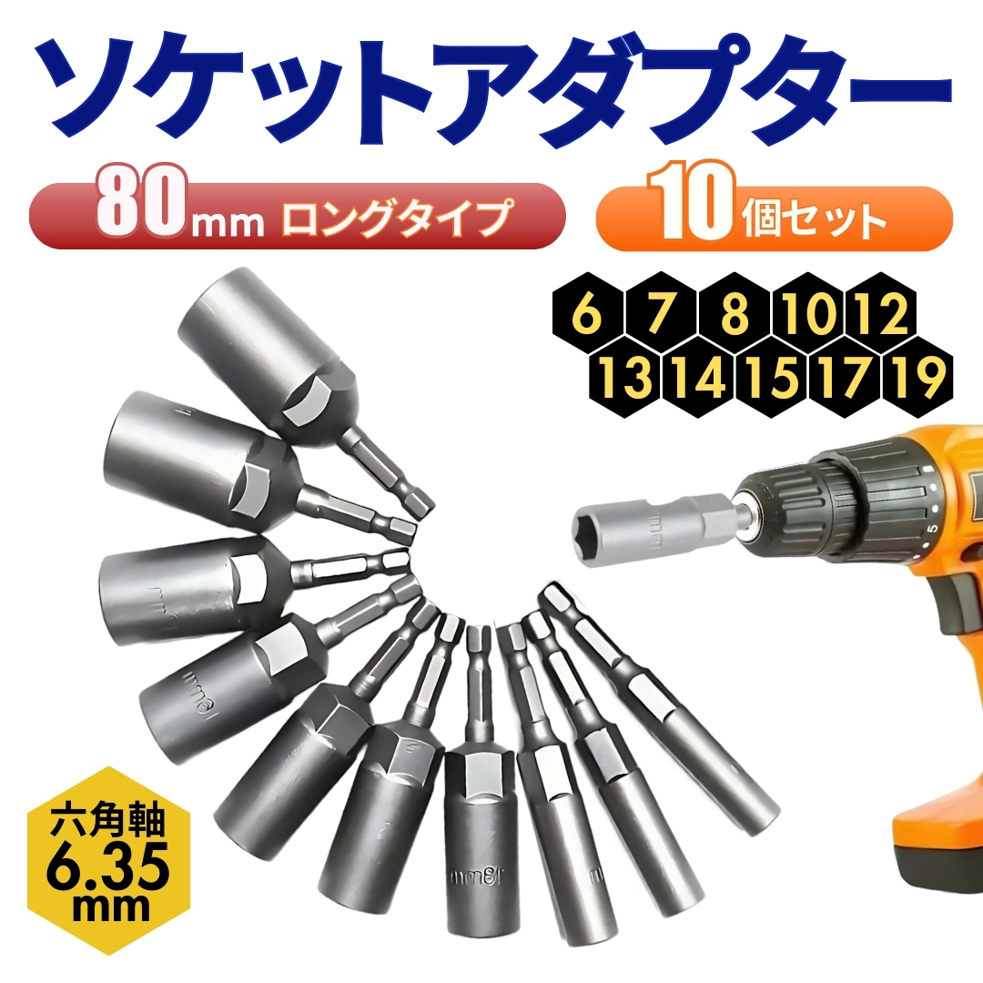 - ディープソケット ソケットアダプター ロング インパクト 10本 セット 80mm ビット ドライバー 電動ドリル 差込角 六角軸 6.35 シャンク