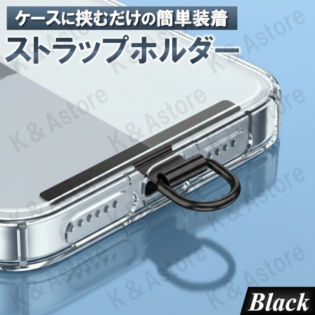 > 【匿名配送】スマホ ストラップ ホルダー 携帯 ショルダー ストラップホール フック iPhone Android 全機種対応 ステンレス 薄型 ブラック