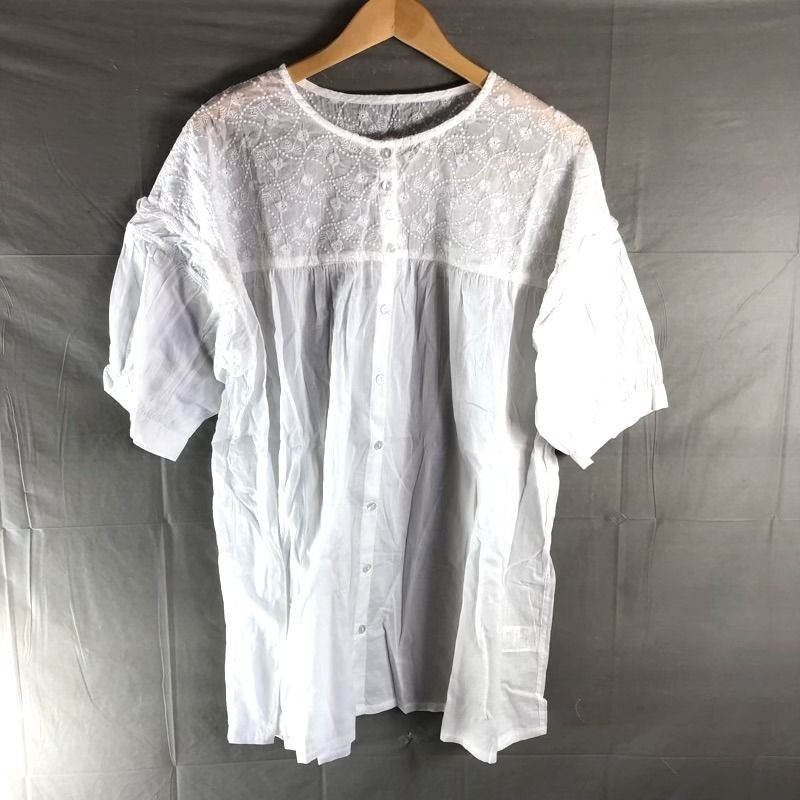 - ブラウス 七分袖 ボタン 刺繍 フリル 綿100% 白 LLサイズ 2025090400217