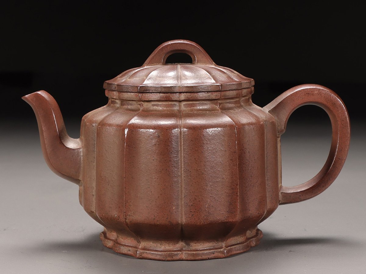 - 【安】清時代 在銘 筋紋茶壺 宜興紫砂 常滑 朱泥急須 煎茶道具 茶壷 古美味 古董品 時代物 395