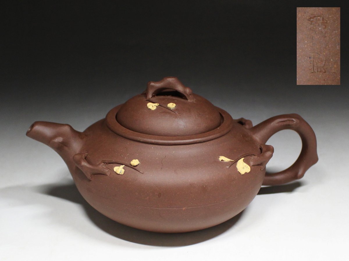 - ◆中国古玩・朱泥・急須・梅枝浮彫・茶壷・茶心壷・紫砂壺・蓋裏款・在印・在銘・唐物・煎茶道具◆a2391M