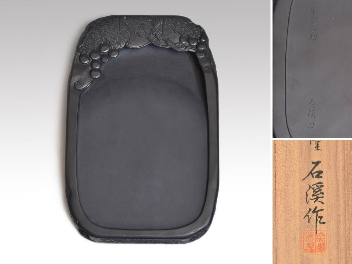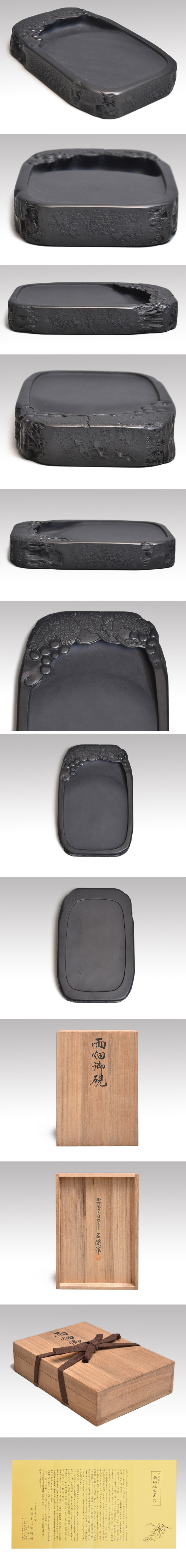 - 雨畑硯 深沢石渓(作)共箱 葡萄彫刻入り 縦21.7cm 2キロ 未使用 y2885