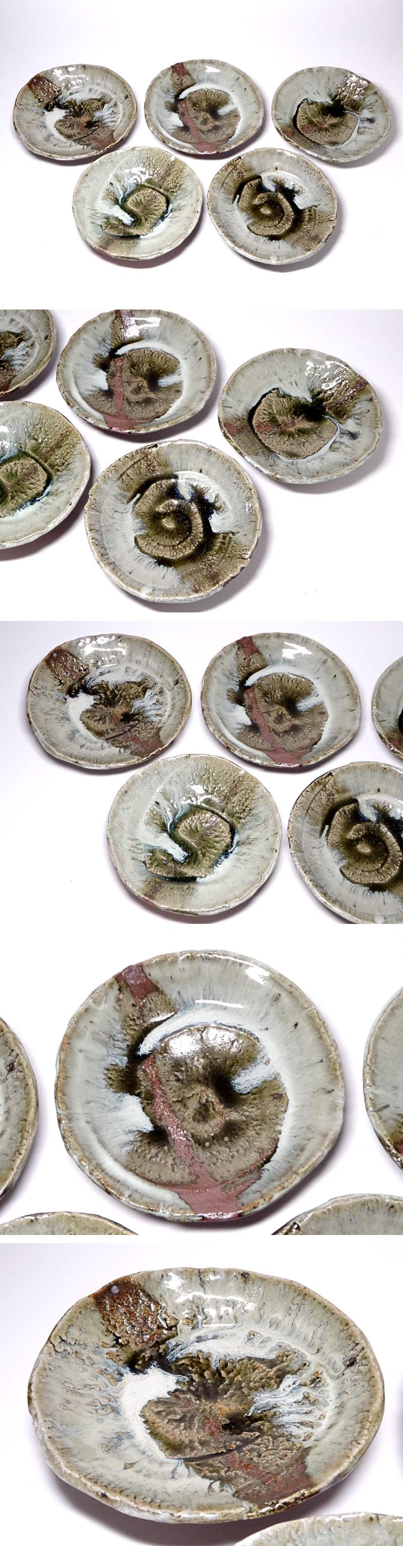- 慶應◆三越個展出品作!【西端正】秀逸作 灰釉掛分皿 五客揃 共箱付 現代丹波焼の代表格