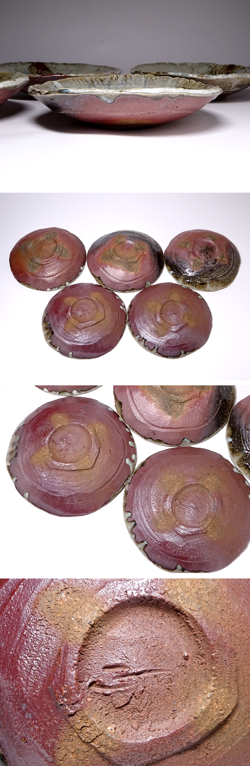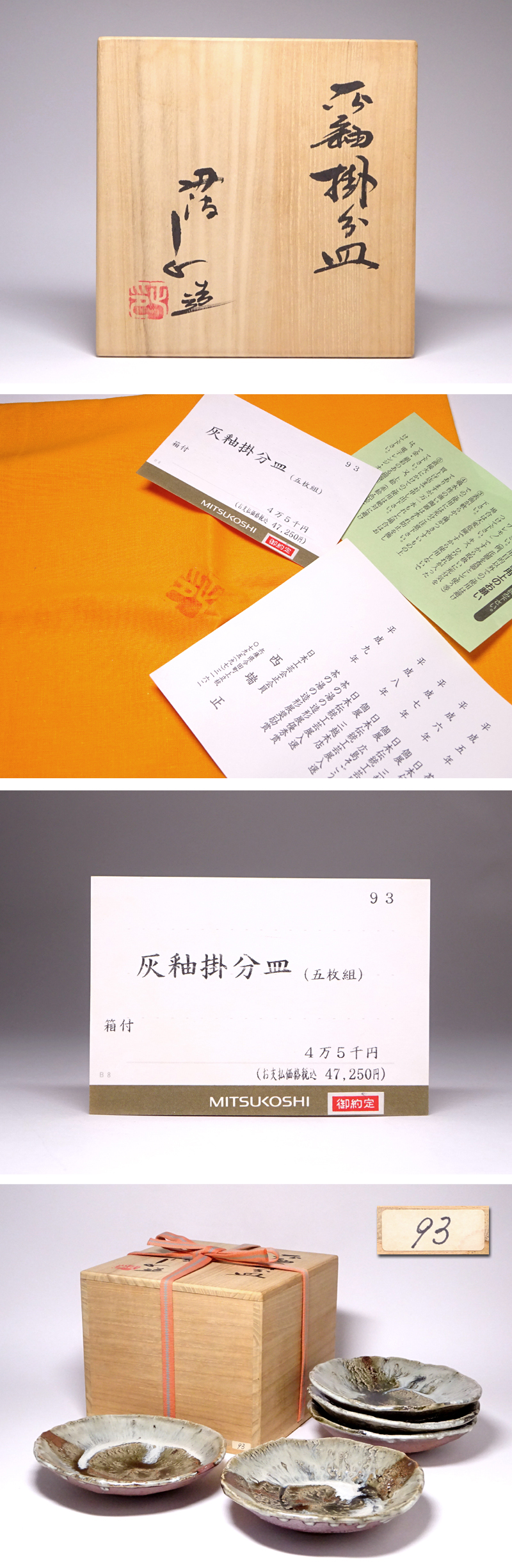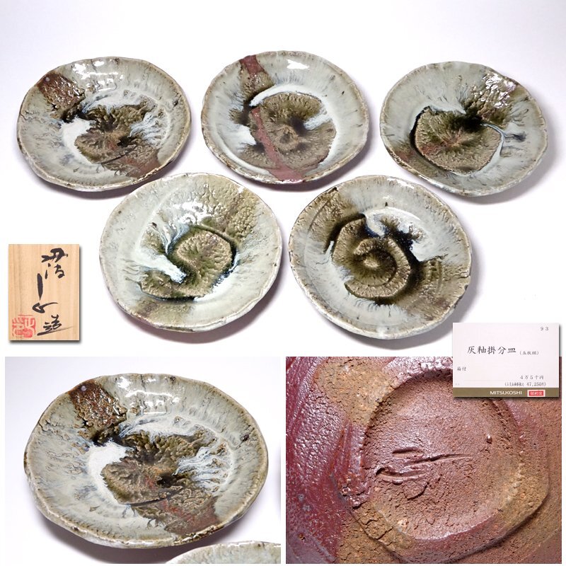 > 慶應◆三越個展出品作!【西端正】秀逸作 灰釉掛分皿 五客揃 共箱付 現代丹波焼の代表格