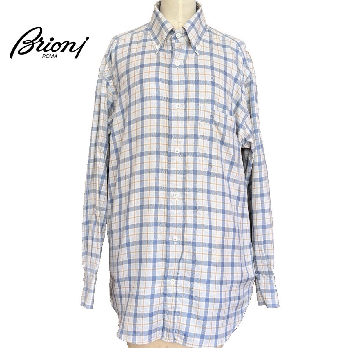 > Brioni ブリオーニ 長袖シャツ ボタンダウンシャツ ネルシャツ フランネル 青 白 ベージュ チェック柄 綿 カジュアル イタリア製 メンズ L
