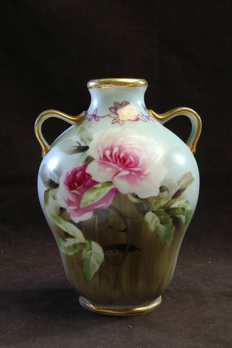 - 3719 オールドノリタケ フラワーベース M-NIPPON 明治 金彩で縁回りを飾った薔薇の絵柄の花器