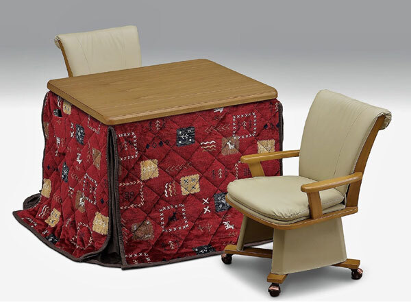 - ハイタイプ/ダイニング高脚コタツ こたつ90×75センチ幅(長方形)+肘付椅子2脚+レッド地色ギャベ柄布団の4点セット ライトブラウン色