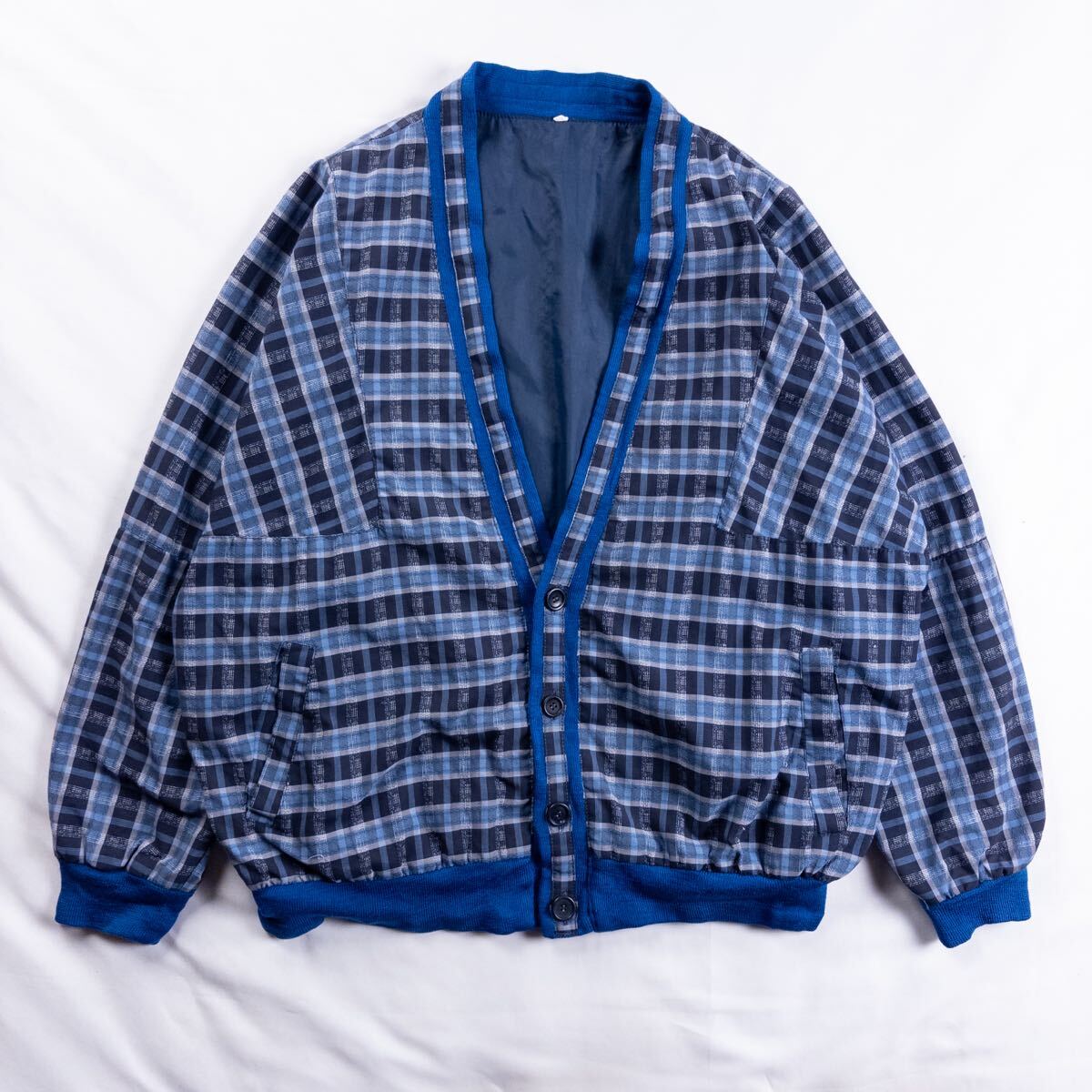 - Euro Vintage Unknown ポリエステル コットン 刺繍 立体 チェック 格子 レトロ アッシュブルー 総柄 デザインカーディガン