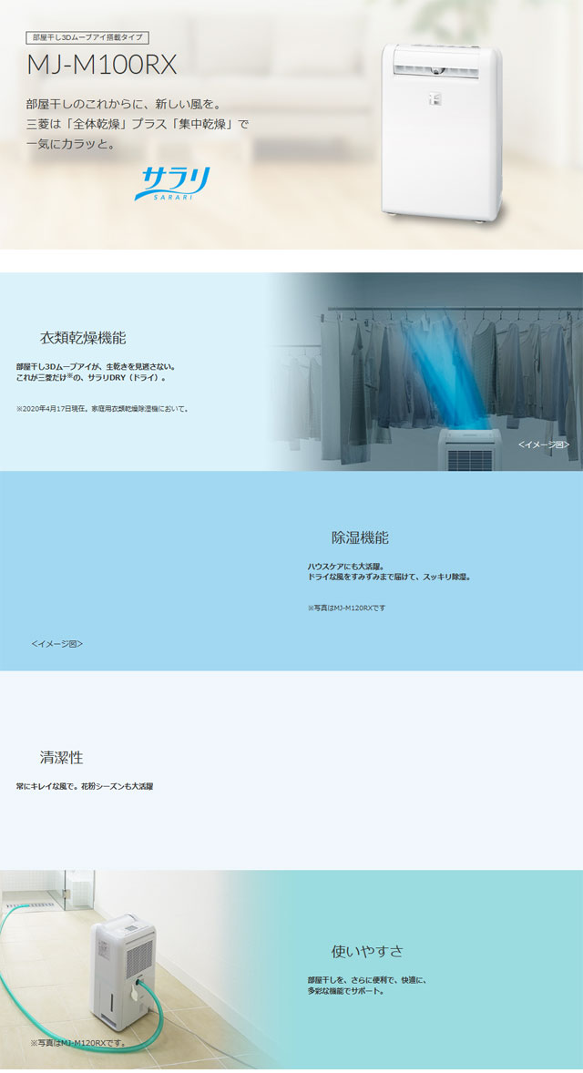 > 三菱電機 衣類乾燥除湿機 サラリ MJ-M100RX(W) 部屋干し3Dムーブアイ搭載タイプ コンプレッサー式 木造13畳/鉄筋25畳 取説付 【長野発】