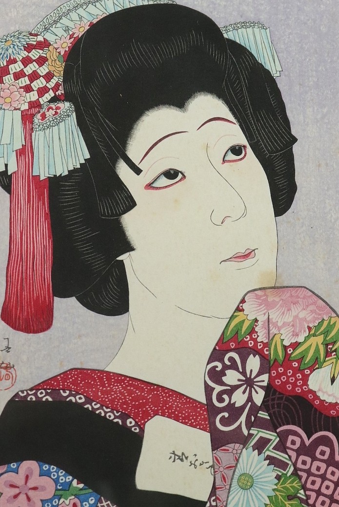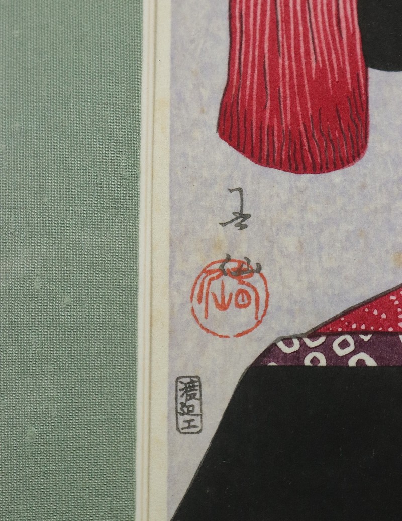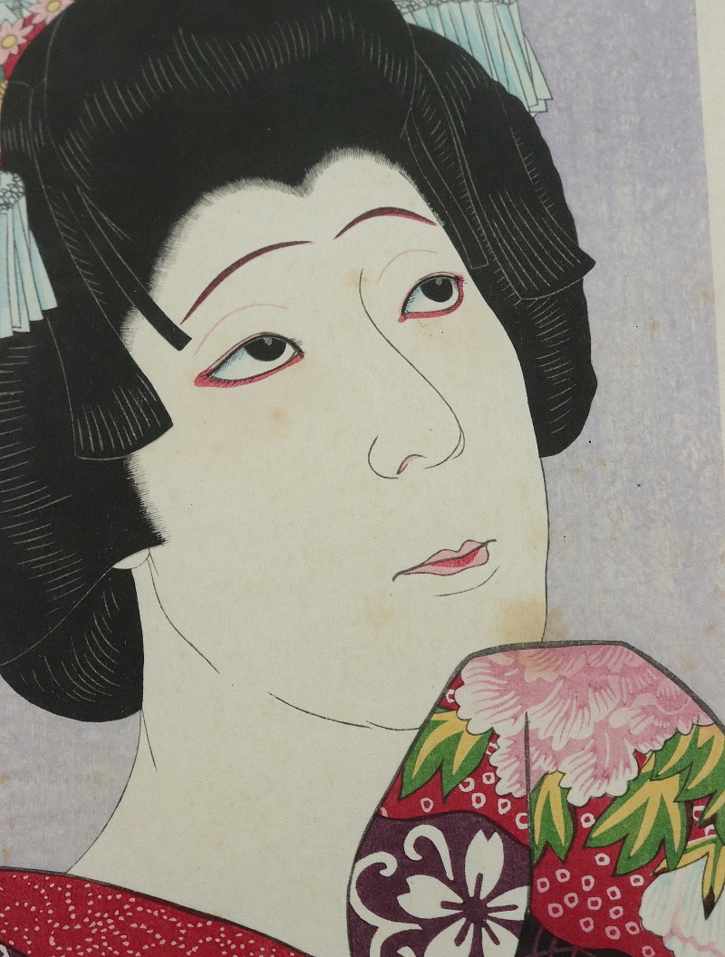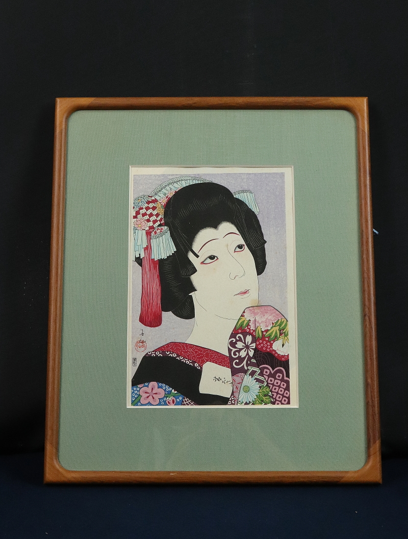 - 11136■【真作】名取春仙 五世中村福助 「信農屋 おはん」 木版 鑑定シール 限定350部 久保田米僊師事 山梨の人 額装