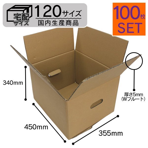 > 【100枚セット】日本製 ダンボール 120サイズ (450mm×355mm×340mm) 新品 即決 段ボール 引越し フリマ 配送 梱包 取っ手穴付き 無地