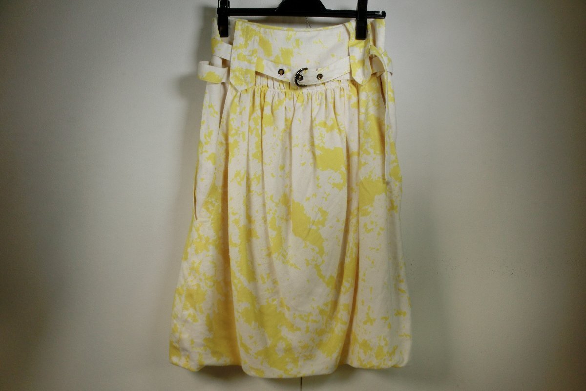 > ♪中古品★RAMUNE PIEKAUTAITE/ラムネ ピーカウタイト(38)★白地黄色プリントベルト付きリネンバルーン風フレアスカート