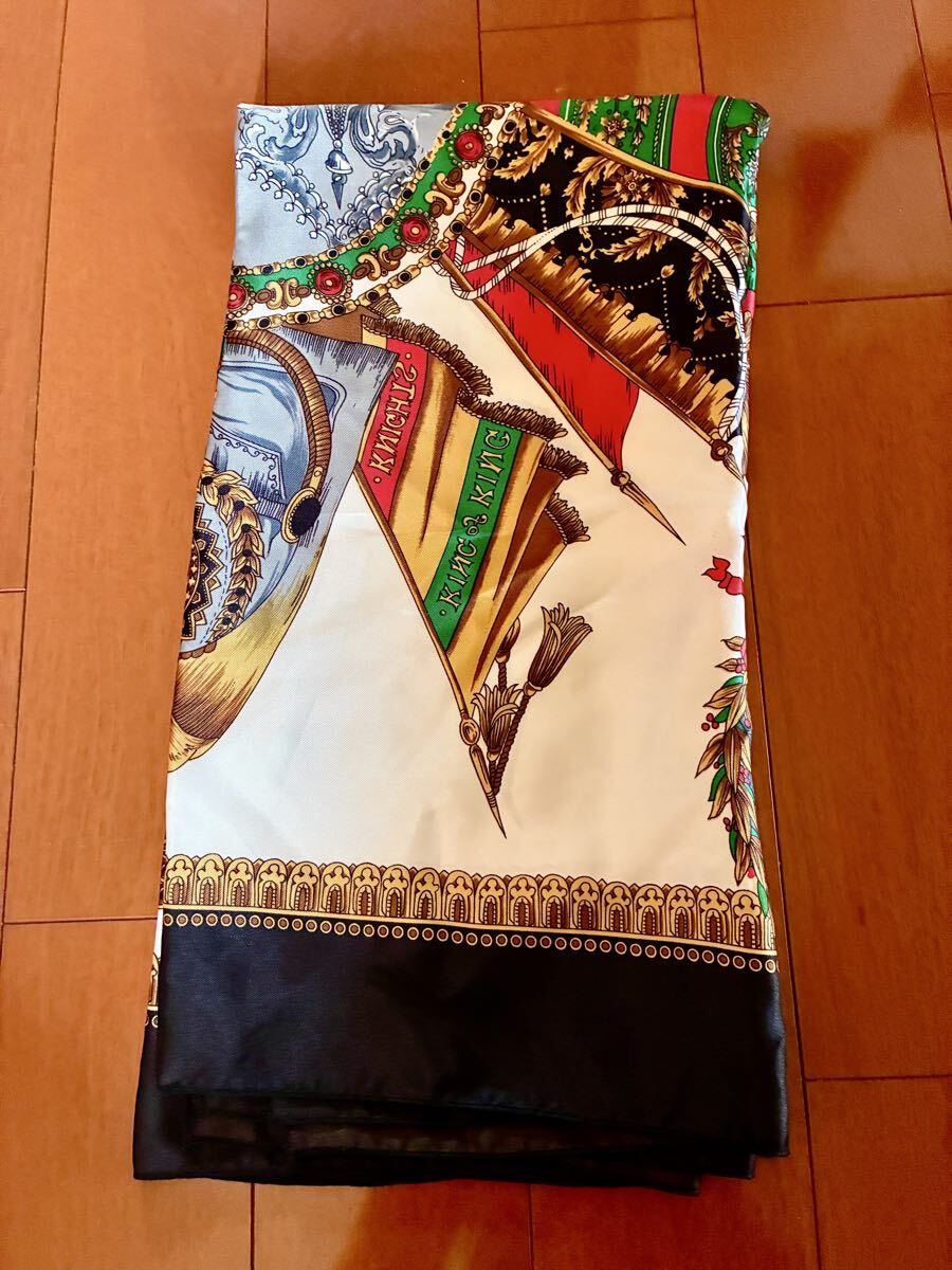 - 美品イタリアヴィンテージショップ購入大判スカーフ85×85cm総柄白黒赤緑レトロ柄♪たぶんポリエステル素材