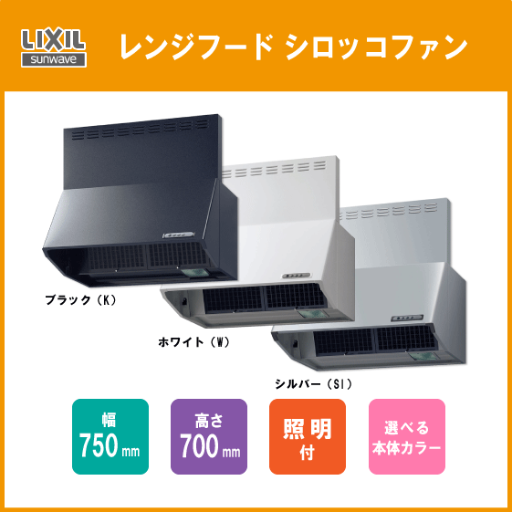 > レンジフード(シロッコファン) NBHシリーズ 幅:75cm 高さ:70cm NBH-7387K,NBH-7387W,NBH-7387SI LIXIL リクシル サンウェーブ