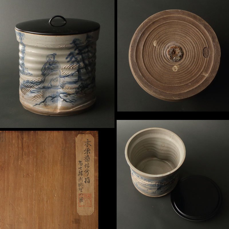 > 委託HK◇青木木米 染付高士楼閣眺望図水指(茶道具 陶磁器 陶芸 木屋佐兵衛 茶陶 染付 呉須 青花 絵付 京焼 古美術 古物 点前 茶席 茶事 )