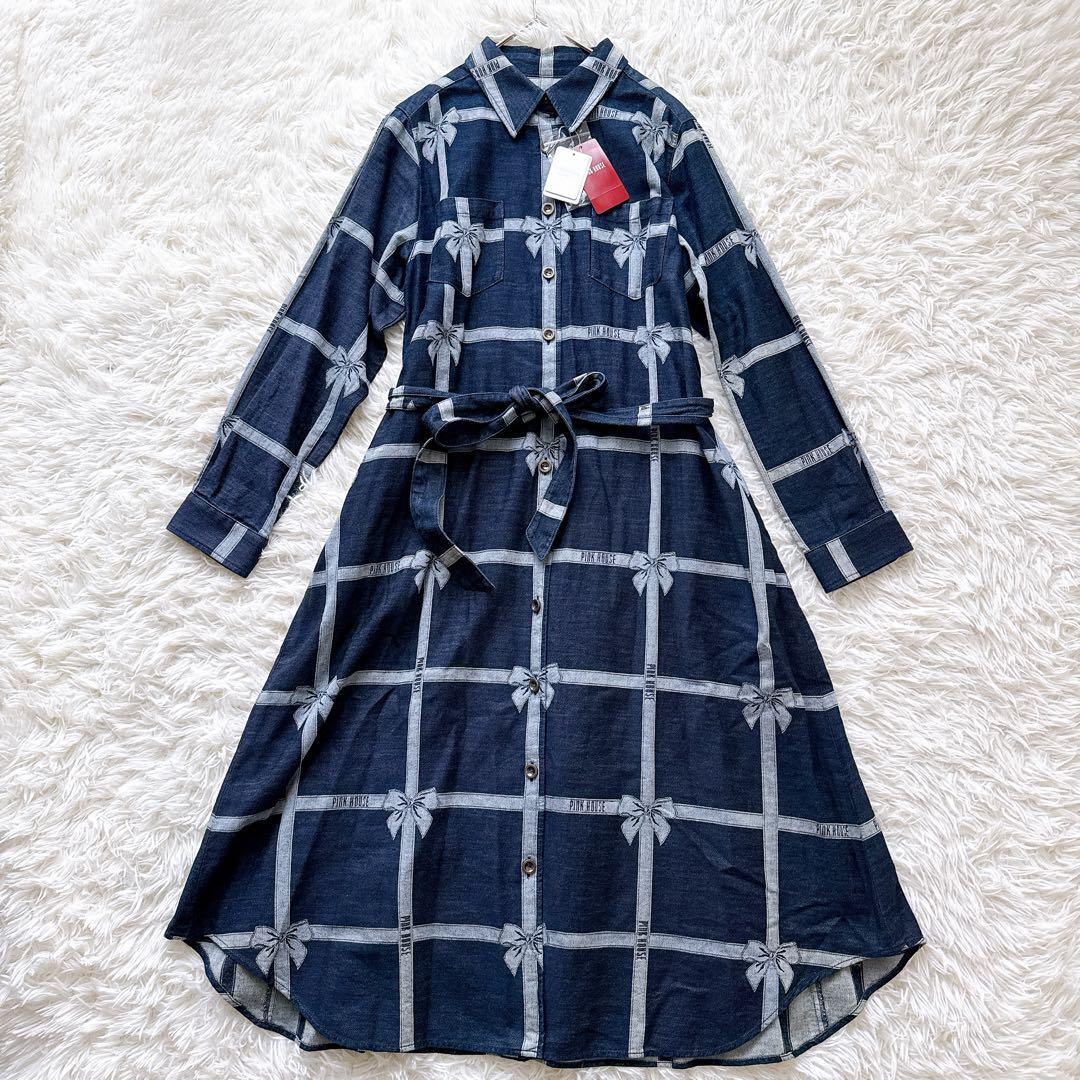 > 24年モデル 未使用タグ付き PINK HOUSE ピンクハウス リボン ジャガードデニムワンピース ウエストベルト付き ネイビー 紺 カジュアル