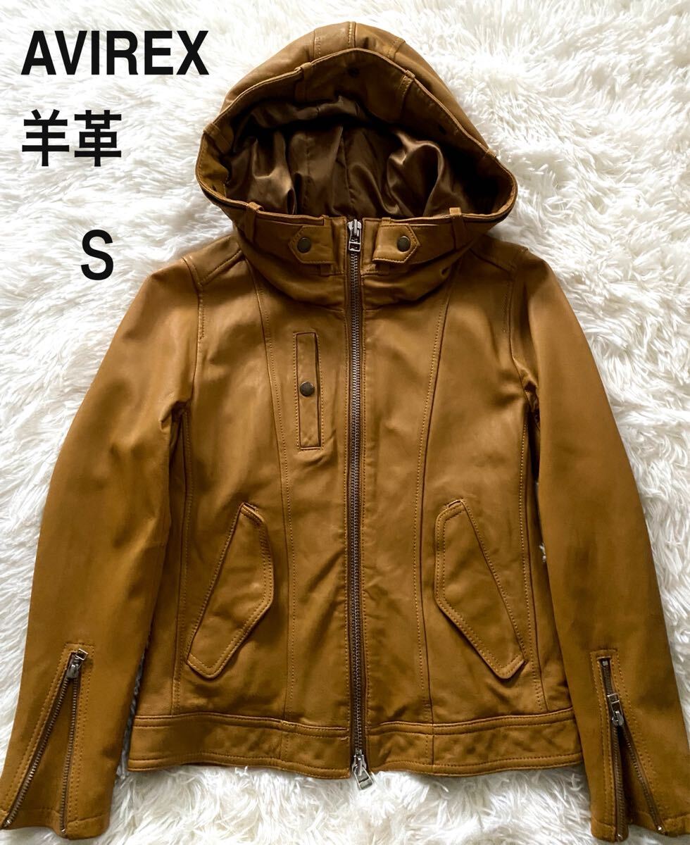 - AVIREX 羊革 シングルライダースレザージャケット S キャメル フ-ド付き