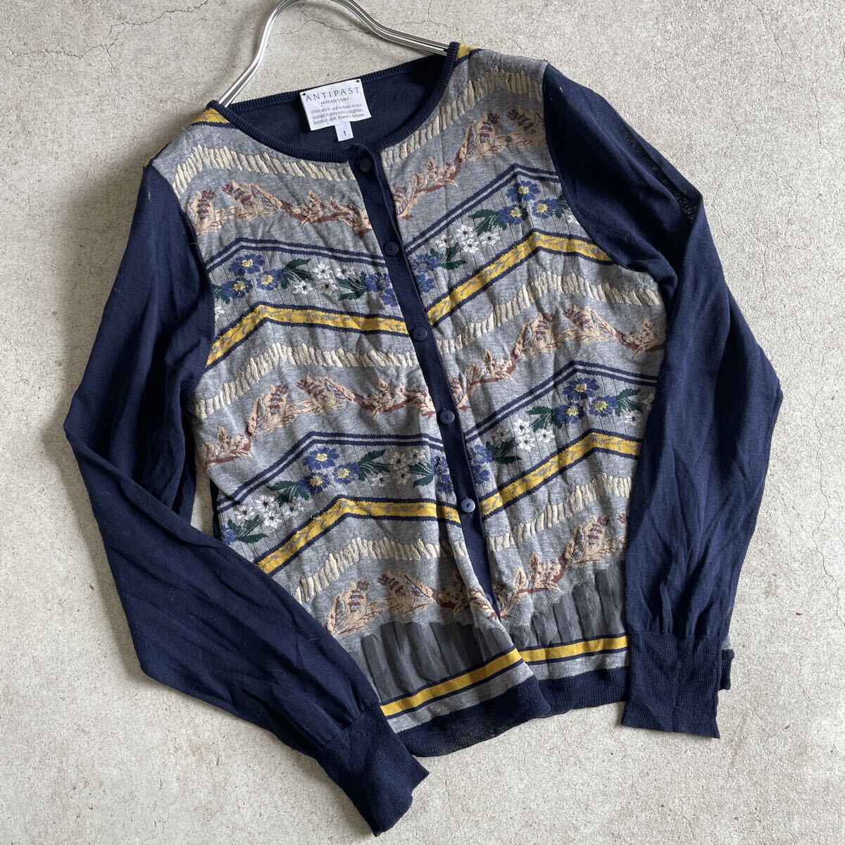 > アンティパスト ANTIPAST 花柄 コットン カーディガン 5 ネイビー 紺色 綿 薄手 カットソー ニット 長袖 クルーネック