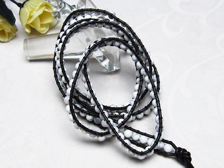 > 銀座東道◆超レア極品天然AAAAAハウライト 4mmビーズ レザー ラップブレスレット 4mm [L01-95-4]
